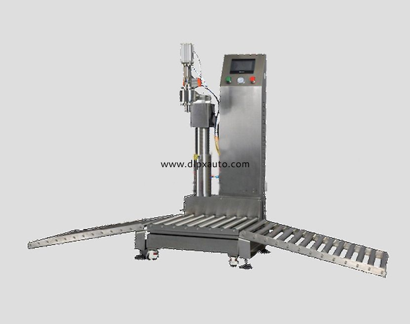 應用案例高灌稱重式灌裝機,原理是由稱重傳感器平臺在PLC的控制下設定計量.是高精度,高技術產品.是集機、電、儀一體化的新型機種,它改變了傳統流量計式灌裝機定量精度及無法對較粘液體的計量缺陷,是文明生產和國家明令規定淘汰杠桿秤后,融稱重與灌裝一體化的理想設備,灌裝時先去除皮重,操作者只需要將容器放入平臺,桶口對準灌裝咀,此時程序啟動,灌裝咀下降,打開灌裝閥進料, 物料在注入容器時先大量快速灌裝后再慢