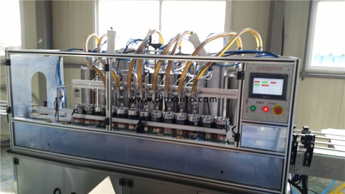 直線液體灌裝機本機為定量式自動充填機,可使用在青體、稀粘體的充填作業,在設計上采用機械為主的直線運動方式,利用PLC邏輯控制器及各種檢測