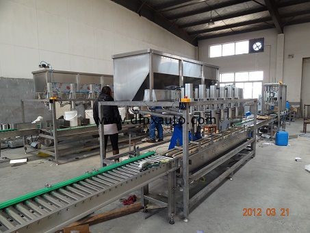 產地:上海特點:全自動,效益高,整套生產線適用范圍:石化、化工、日化,制藥,食品,農藥等流體使用說明手紅放桶一自動輸送一6頭自動定位稱重灌裝 自動理蓋一 自動旋蓋一 重 量檢測一-自動貼標- -自動噴碼一輸送到碼垛位一 半自動碼垛- 托盤輸送-叉車運走2.產品介紹:2.1.采用稱重灌裝傳感器,使用穩定、壽命長;2.2. PLC控制稱重,高精度;2.3.雙速灌裝(開始時快速灌裝,接近目標量時慢速灌裝