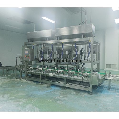 人工上桶,自動輸送,自動對口,自動灌裝,自動放蓋,自動擰蓋,自動輸送,自動碼垛