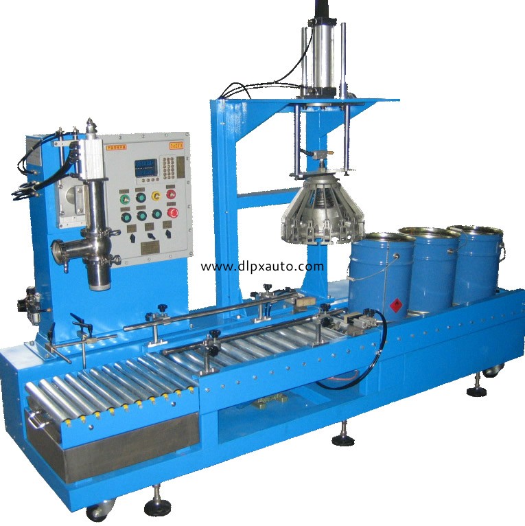 本設備是20L防爆式梅花壓蓋灌裝機(型號YCS-20L)廣泛應用于化工、糧食、農藥等與液體狀物料相關的行業,適用在聚氨酯、多元醇、聚醚、聚酯、樹脂、涂料、油漆、油墨、膠粘劑、固化劑、染料、清洗劑、機油、潤滑油、食用油、香精、溶劑、助劑、農藥及其他危險性化學產品等產品中。動作流程:人工將空桶放到秤臺上,,然后點擊啟動按鈕,儀表首先判桶并扣除空桶皮重,灌裝頭下降并插入桶內并打開進入快速落料,當達到慢進