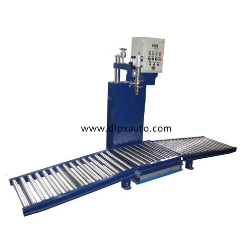 本設備是200L液面式灌裝機(型號YCS-200L)廣泛應用于化工、糧食、農藥等與液體狀物料相關的行業,適用在聚氨酯、多元醇、聚醚、聚酯、樹脂、涂料、油漆、油墨、膠粘劑、固化劑、染料、清洗劑、機油、潤滑油、食用油、香精、溶劑、助劑、農藥及其他危險性化學產品等產品中。動作流程:人工將空桶放到秤臺上,,然后點擊啟動按鈕,儀表首先判桶并扣除空桶皮重,灌裝頭插入桶內打開進入快速落料,當達到慢進料設定重量時