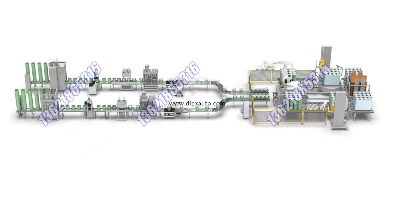 組成部分:人工上桶垛(桶垛提升機)、自動立式分桶機、自動轉桶打印貼標機、全自動稱 重式灌裝機、全自動送蓋落蓋壓蓋機、在線檢重及剔除、轉桶定位、自動供棧 機、機器人碼垛機組、自動水平捆扎機參數信息:灌裝精度: ±0.1%灌裝容量: 10-20L灌裝頭數: 2頭/4頭/6頭生產速度: 800-1500桶/小時(雙線)適用范圍: 各種乳膠漆、水漆、油漆等