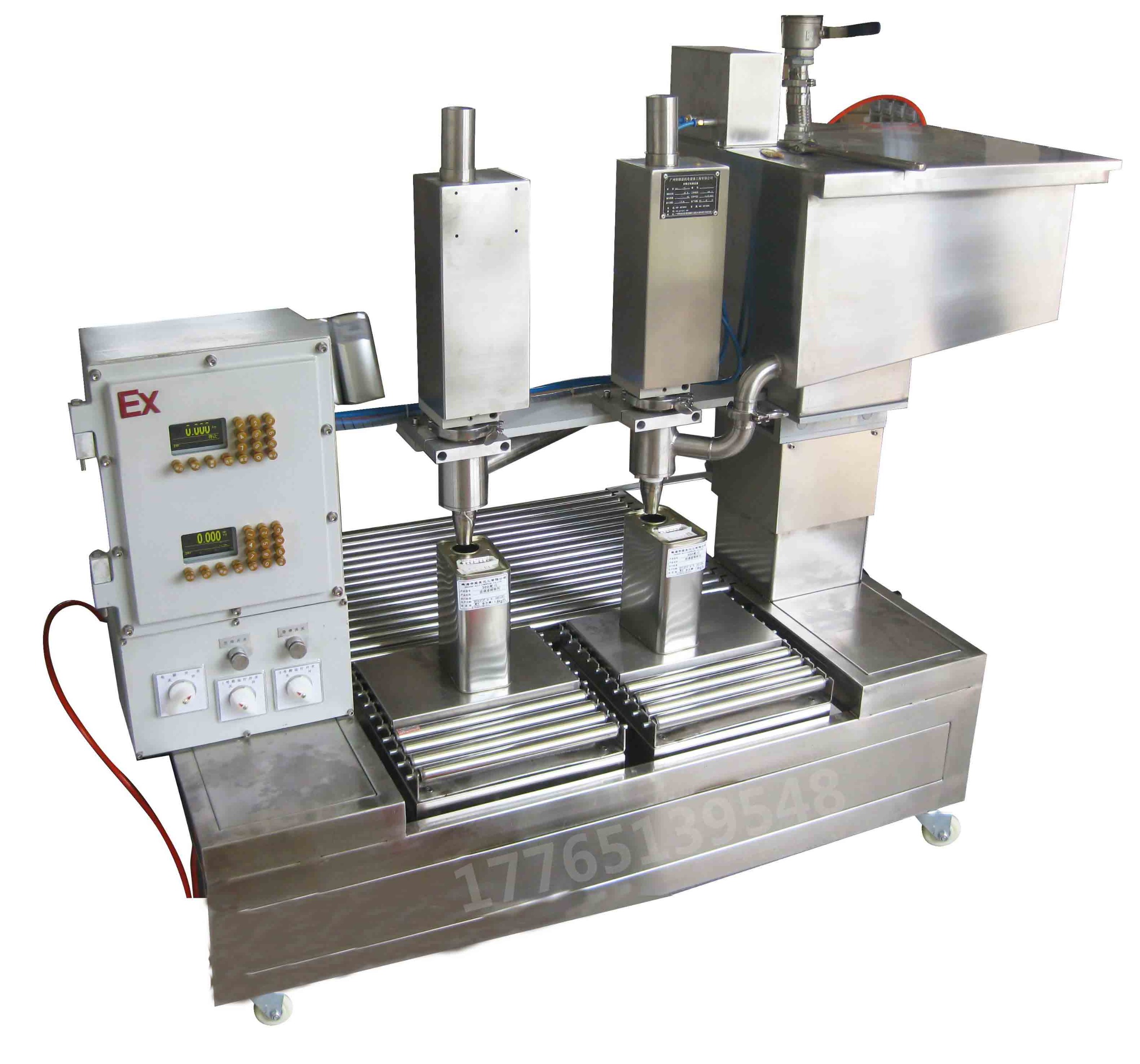 操作簡便:雙頭稱重式分裝機的操作流程通常簡單明了,易于操作人員掌握,如凝膠分裝機的操作流程包括開機--叉車放桶至秤臺---操作灌手柄,按剎車解除鈕并左右、前后快速對口--釋放剎車解除鈕,灌緊緊固定--按【開始】鍵--灌自動插入桶口--自動去皮--自動打開灌及球閥組---大、小、微量三段灌裝---灌自動隨液面自動提升---到達目標值---灌自動關閉并升至桶外。
