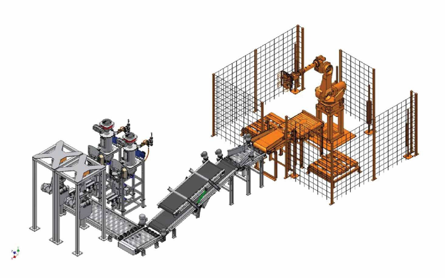 針對大批量生產(chǎn)環(huán)境,閥門裝袋系統(tǒng)配置多臺袋裝液體灌裝機,并配以自動上袋機和自動化機器人袋碼垛系統(tǒng)。像這樣的系統(tǒng)每條生產(chǎn)線每小時可以裝袋和堆疊 350-1,300 個袋子。