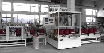 適用產品:潤滑油,涂料,油漆,油墨、潤滑脂、潤滑油、膩子、固化劑、凡士林等等液體以及半流體桶裝定量灌裝??膳涮资褂米詣由贤胺滞?,自動上蓋壓蓋封蓋,自動碼垛等全自動生產線設備
