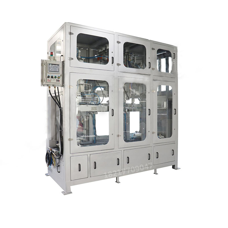 ■ 在灌裝系統(tǒng)的控制下,灌裝自動定位找到桶口,灌裝頭自動插入桶口,并將空桶自動去皮,系統(tǒng)打開球閥,進(jìn)行大中小料三段式灌裝;