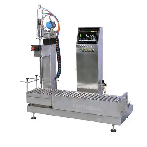 工作流程:空桶自動輸送-空桶撥至稱重區同時自動對桶口-空桶自動除皮-自動定量灌裝-自動推重桶至鏈板輸送線-自動上蓋同時自動鎖蓋-重桶輸送到重桶待提區-人工提走即完成;