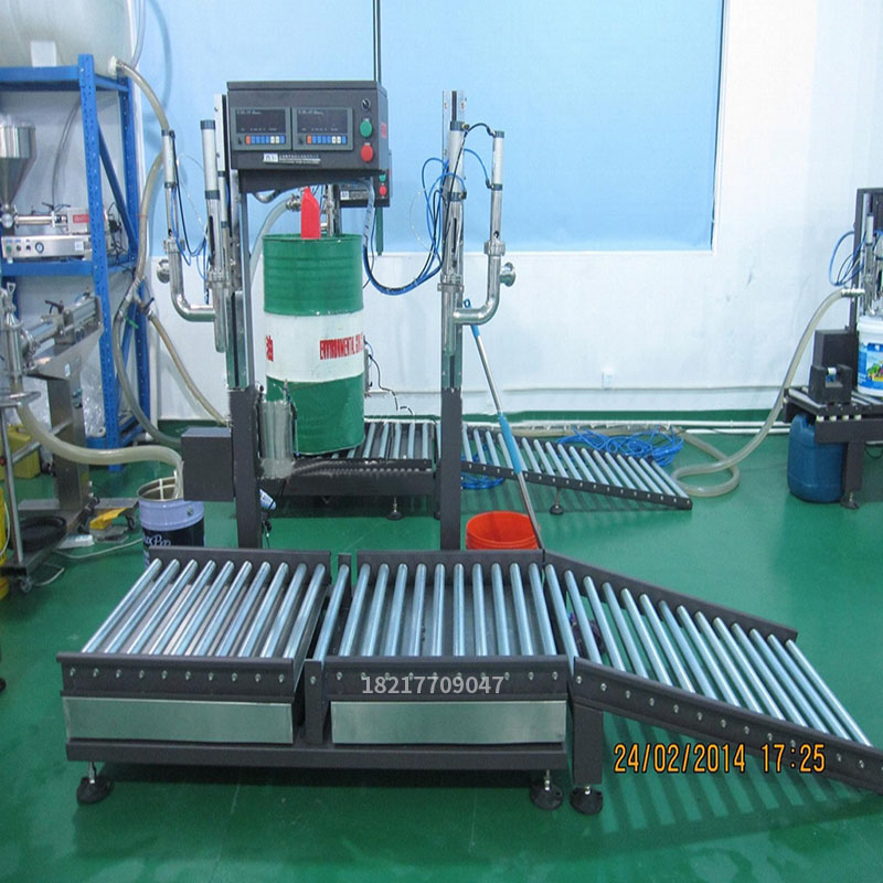 操作流程:開機---(選擇A/B槍)---人工放桶至秤臺---按【開始】鍵---灌槍自動插入桶口---自動去皮---自動打開灌槍及球閥組開始灌裝---大、小、微量三段灌裝---到達目標值---灌槍自動關閉并升至桶外---灌裝完成。