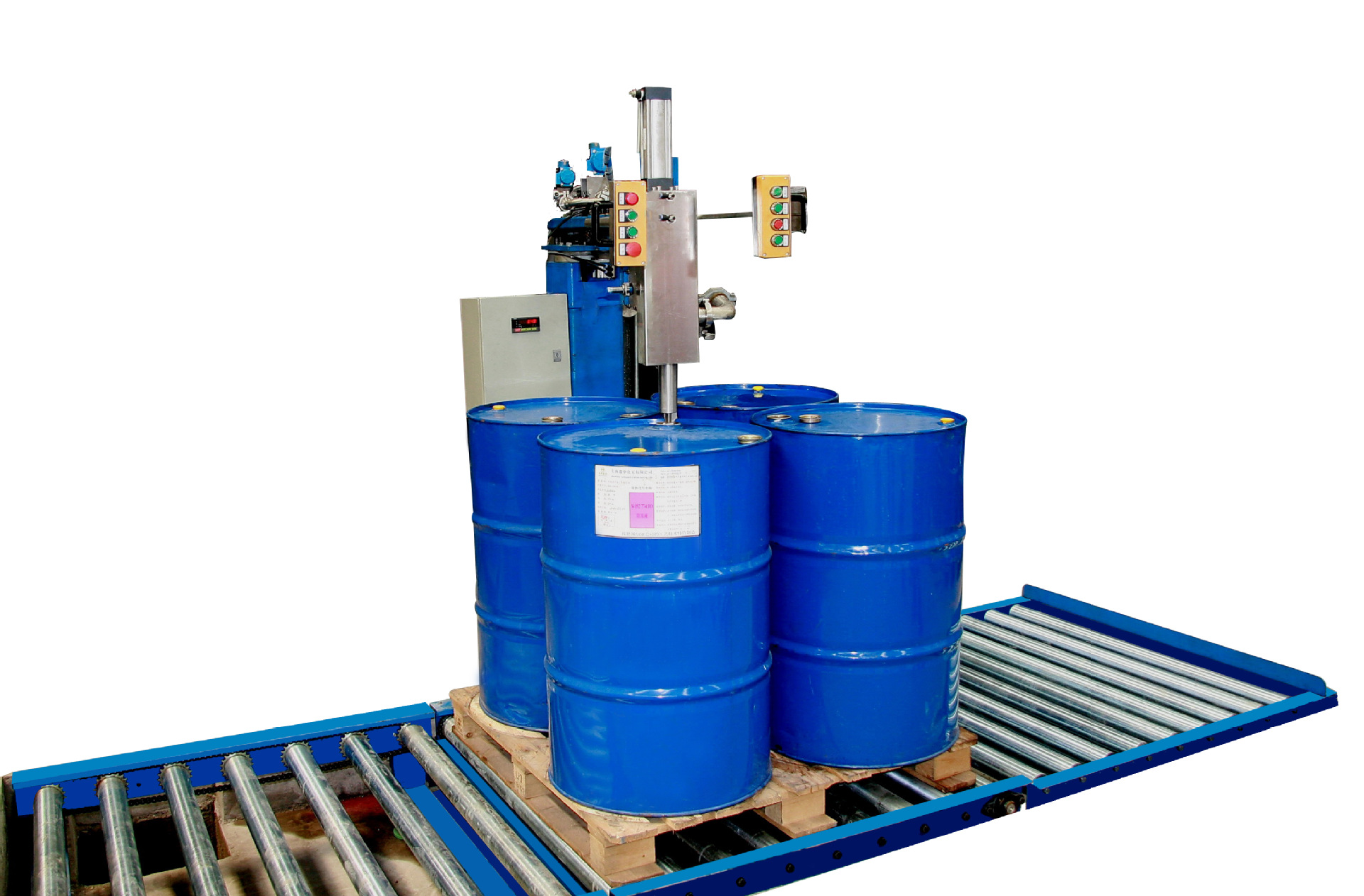 適用于石油化工、醫(yī)藥、食品、軍工等企業(yè)工作環(huán)境的液體灌裝機(jī),采用液面下灌裝方式,適用于多種液體物料。設(shè)計(jì)獨(dú)特的噴槍裝置易于操作,灌注快速、精確;并且灌裝機(jī)大限度地保證灌注完畢時(shí)殘液的滴漏。操作時(shí),操作者僅需簡單地將桶口對(duì)準(zhǔn)噴槍嘴正下方,按下手柄上的[啟動(dòng)]按鈕, 噴槍就回自動(dòng)插入桶內(nèi),并將空桶自動(dòng)去皮。然后打開灌裝閥門,精確地雙速灌裝;灌裝結(jié)束,噴槍自動(dòng)提升至桶外,滴漏盤自動(dòng)接至噴槍底部,人工將桶推出磅臺(tái)推至輸送機(jī)后端即告完成。廣泛應(yīng)用于食品加工、制藥行業(yè)的生產(chǎn)車間及倉庫管理;化工行業(yè)中油漆、精細(xì)化工原料的生產(chǎn)工序控制和成品、半成品計(jì)量;軍工制造業(yè)中物料的計(jì)量。