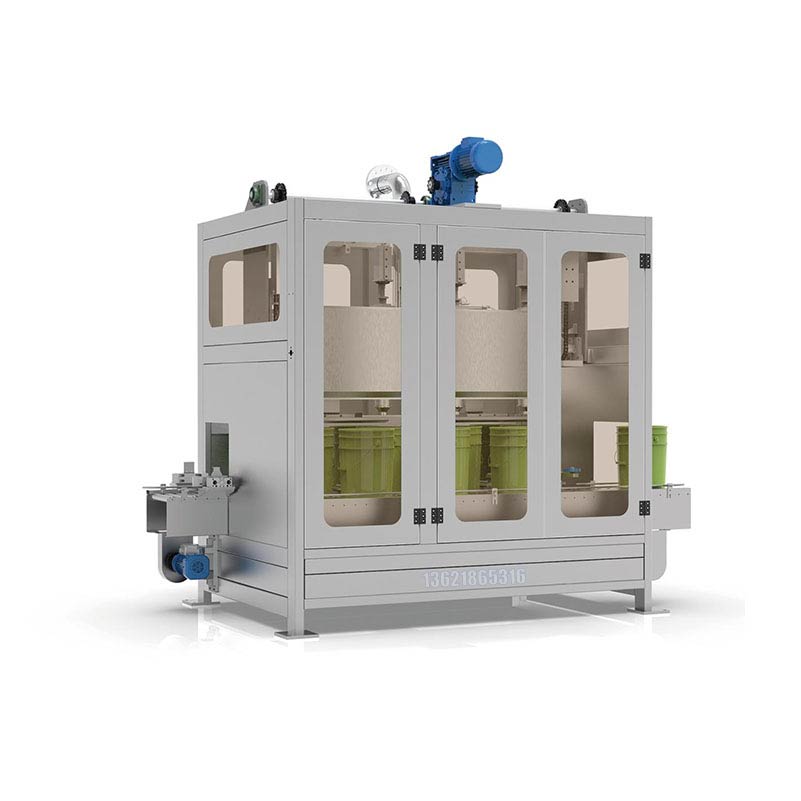 工作流程:空桶自動輸送 - 空桶撥至稱重區同時自動對桶口 - 空桶自動除皮 - 自動定量灌裝 - 自動推重桶至鏈板輸送線 - 自動上蓋同時自動鎖蓋 - 重桶輸送到重桶待提區 - 人工提走即完成