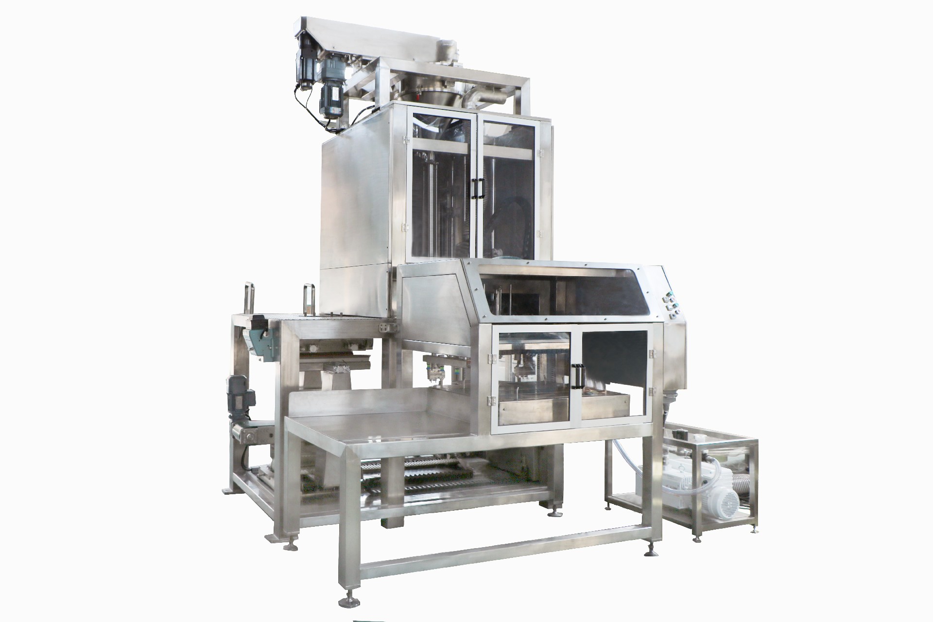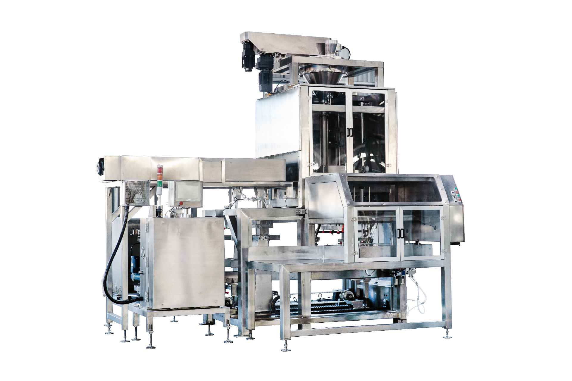 概述DLPX-25型全自動粉體包裝機組(以下簡稱包裝機組)是我公司針對鋰電、食品、化工、醫藥等行業,超細 粉狀物料包裝而研制的新型包裝機組。該包裝機組具有自動上袋、自動稱量、升降式充填、自動脫氣、自動送包、 自動封口等功能。該包裝機組具有自動化程度高、縫修方便、穩定可靠、無塵環保等特點。其自動化程度,和人機 界面可操作性已達到國際先進水平.對于容易揚塵的超細粉末、及高精度的新型粉末材料的粉體包裝,
