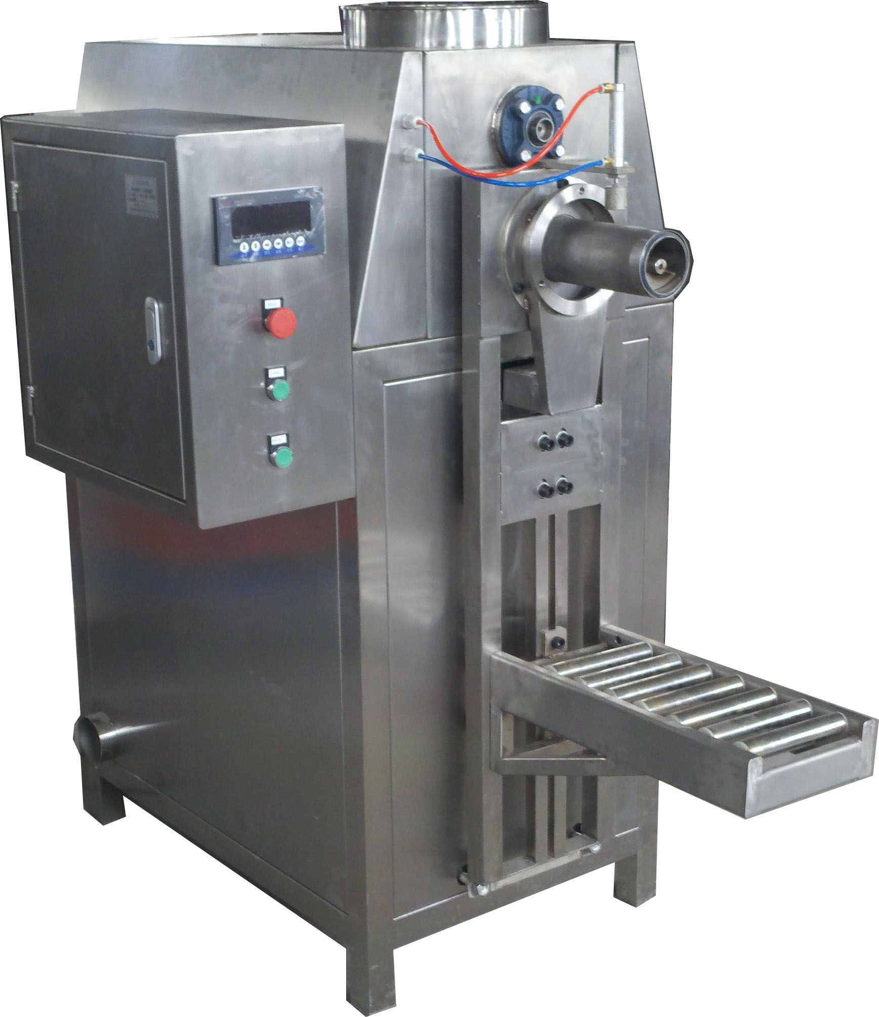 將閥口包裝袋套在加料嘴上,按動“允加”按鈕,這時壓袋氣缸開始工作并壓住袋口,控制器將包裝袋重量自動去除,破拱電機緩慢轉動,保證下料暢通。加料螺旋高速轉動迅速將物料灌入袋中,隨袋中空氣一起溢出的粉塵通過吸塵器由除塵器吸走,振動裝置同時啟動將托盤上袋中物料振實充滿袋角。待加料快到設定值時,加料螺旋進行減速慢加,到設定值時,加料停止。誤差<0.3%。這時壓袋氣缸松開袋口,將包裝袋放在皮帶輸送機上及時送出。
